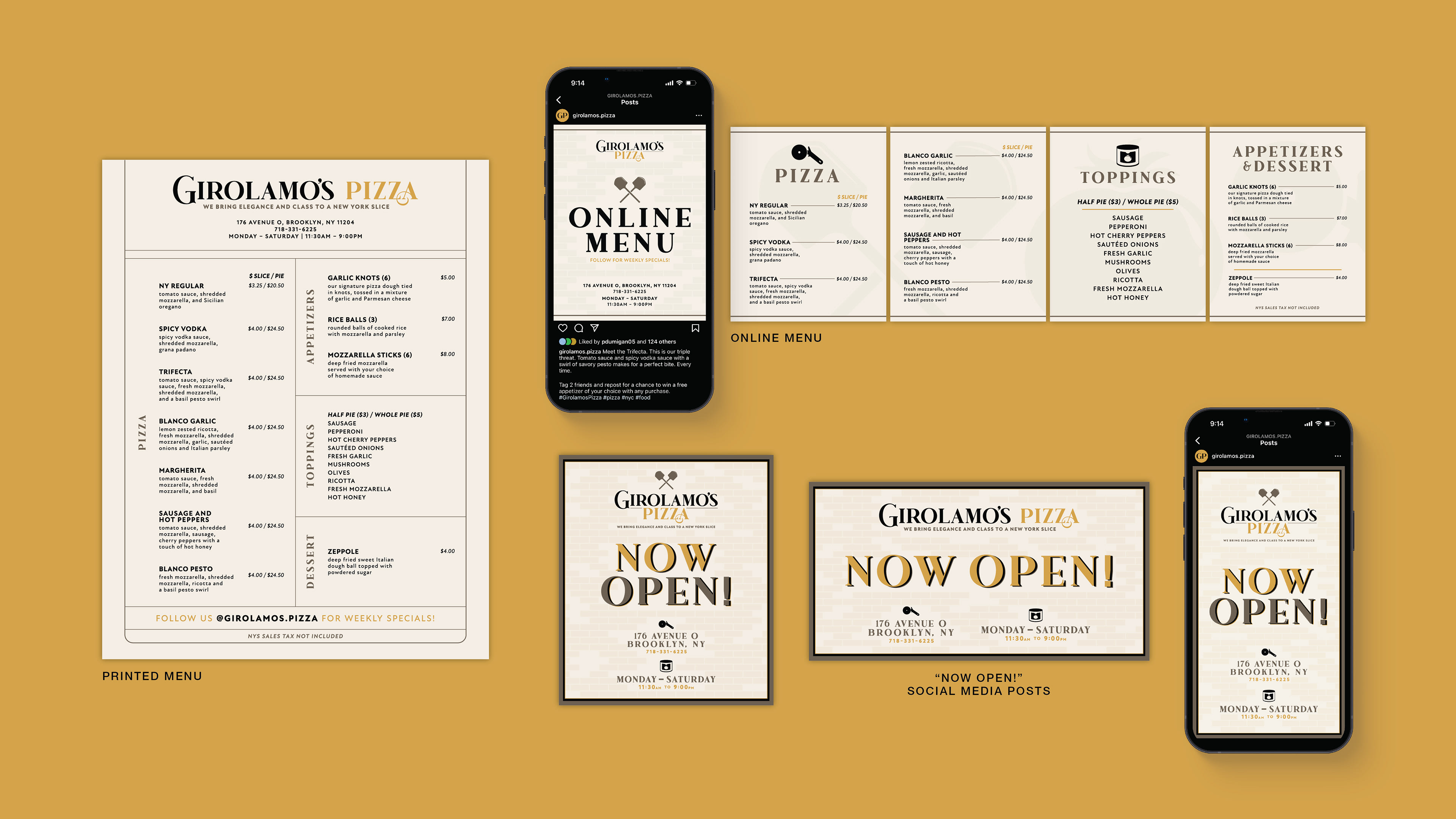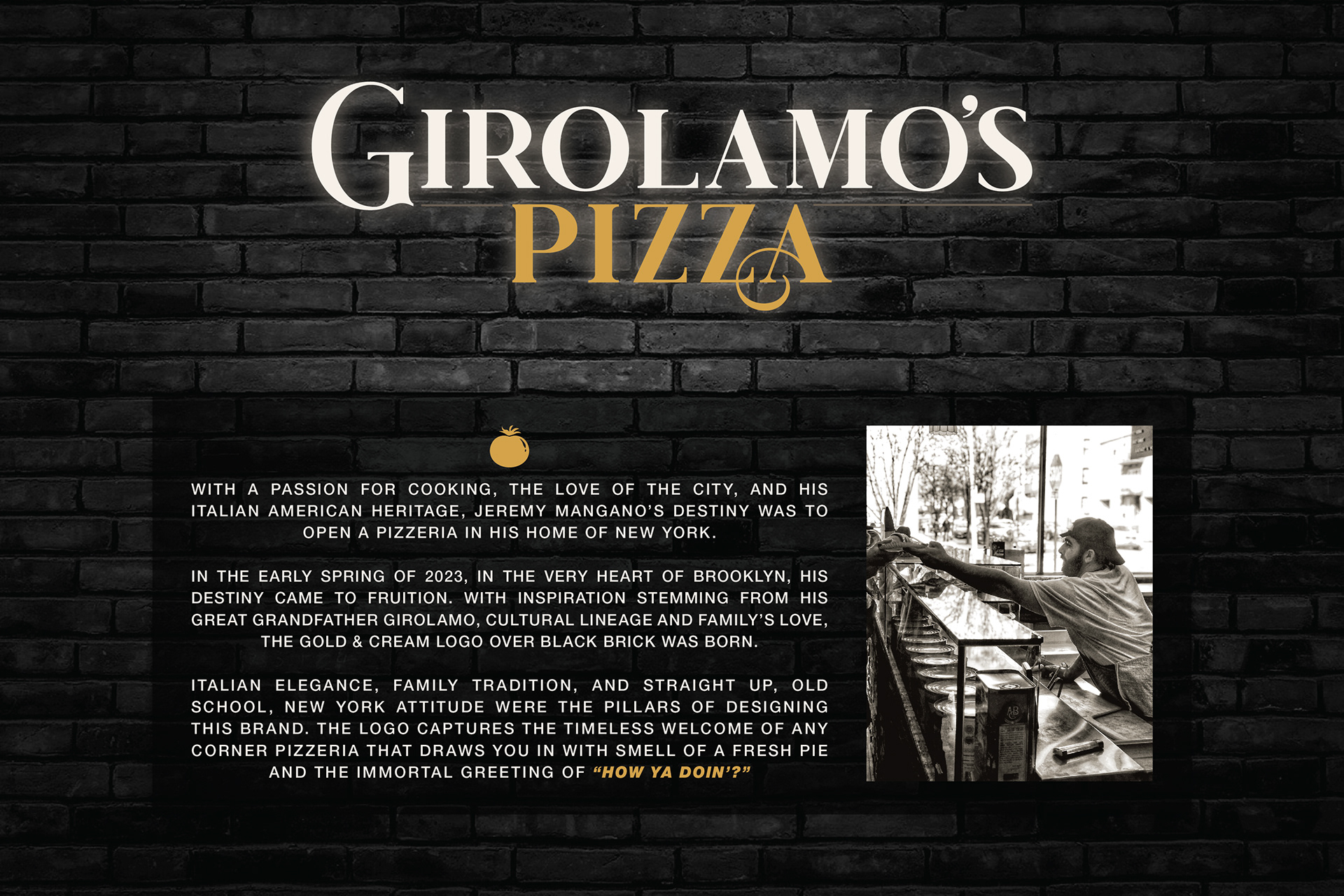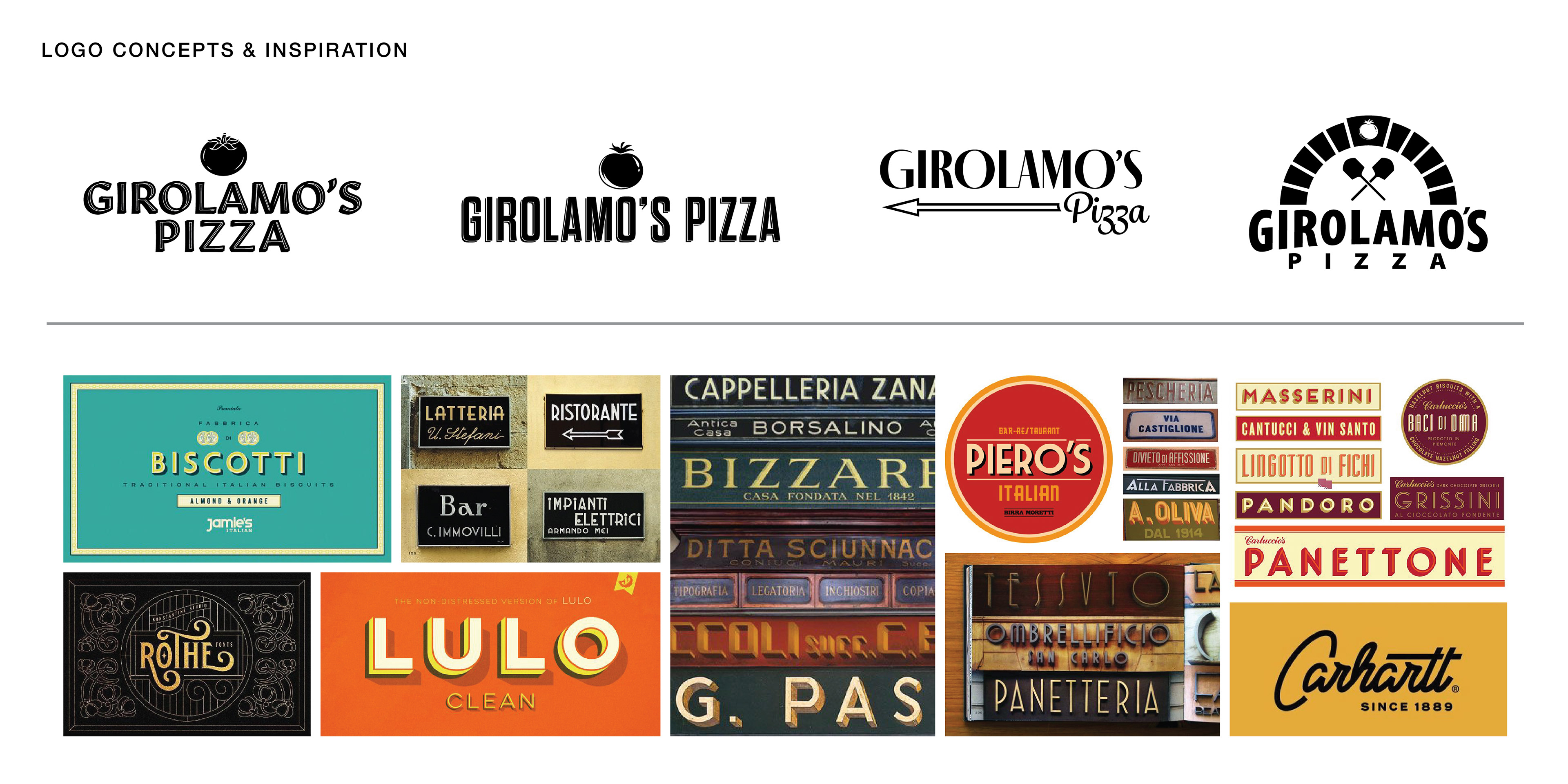 The full branding for Girolamo's Pizza, located in Brooklyn, NY. Logo & brand inspiration, concepts, final lockup, menu design, social media content, mock & real world signage. 2023