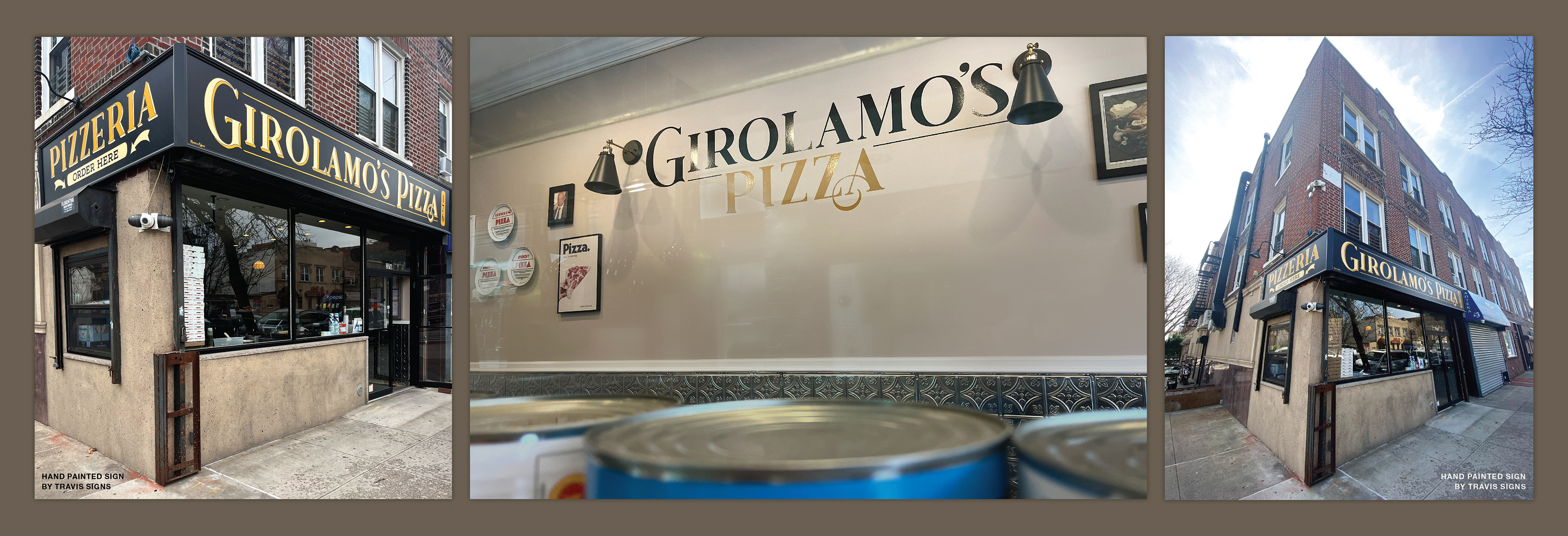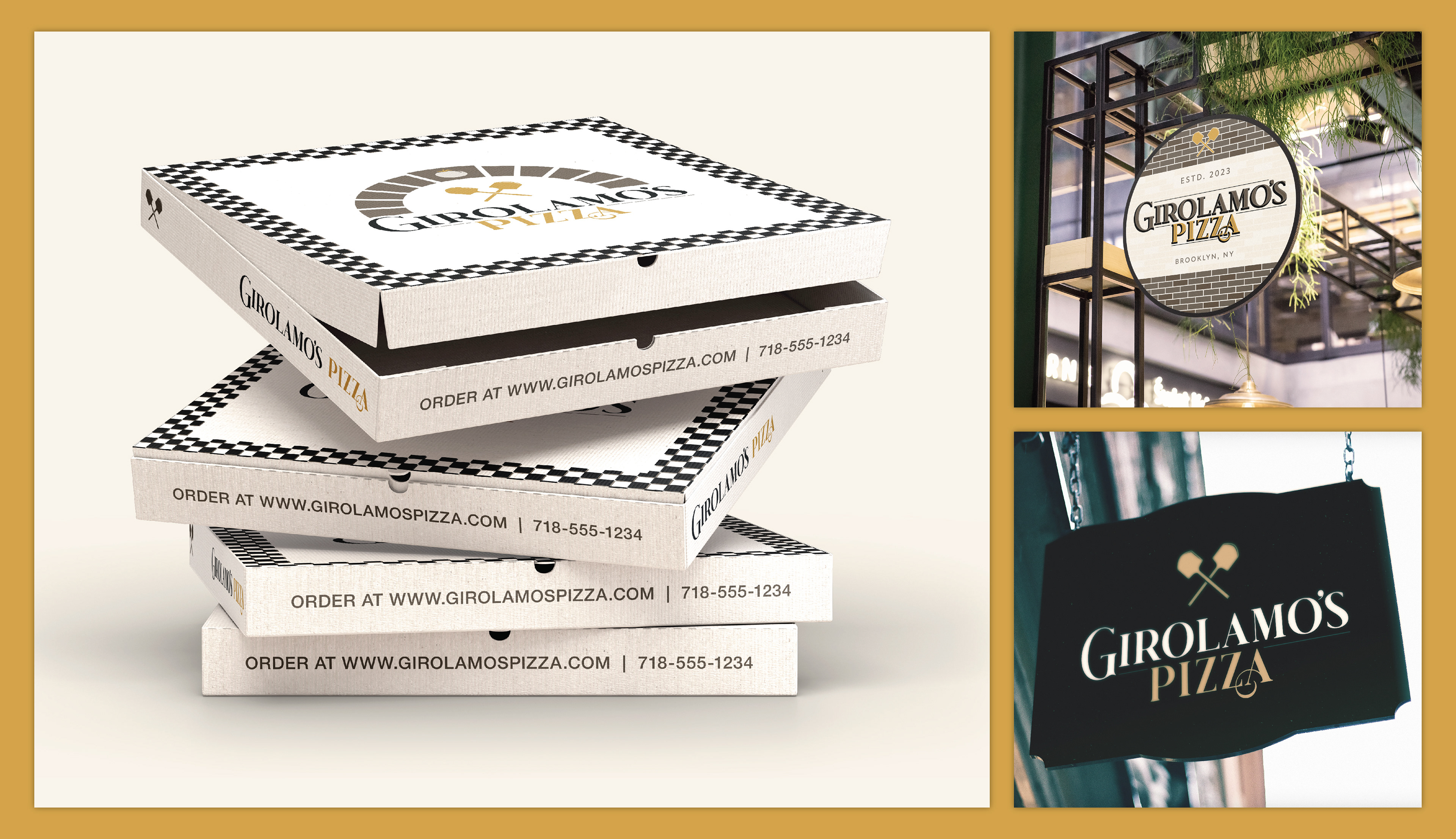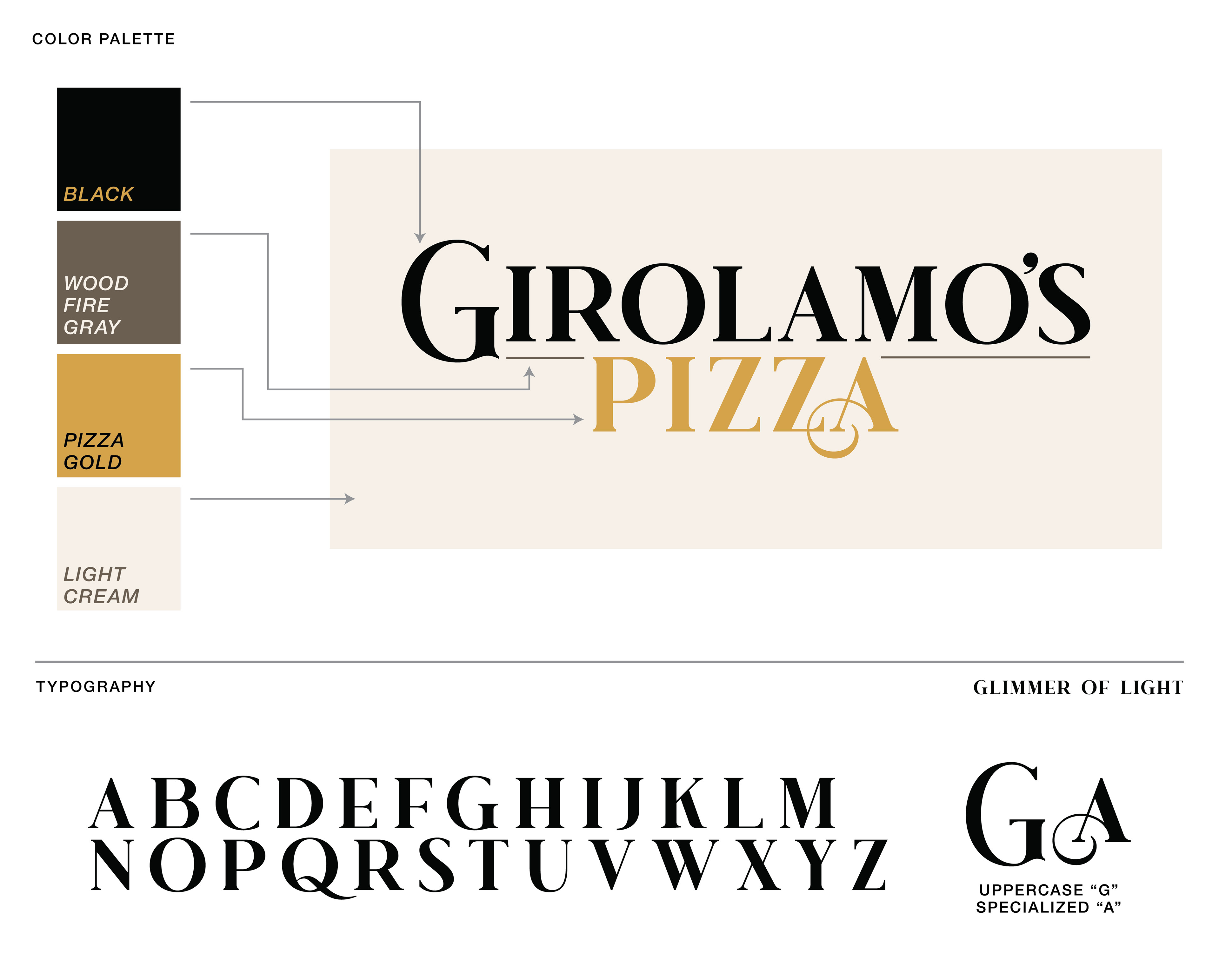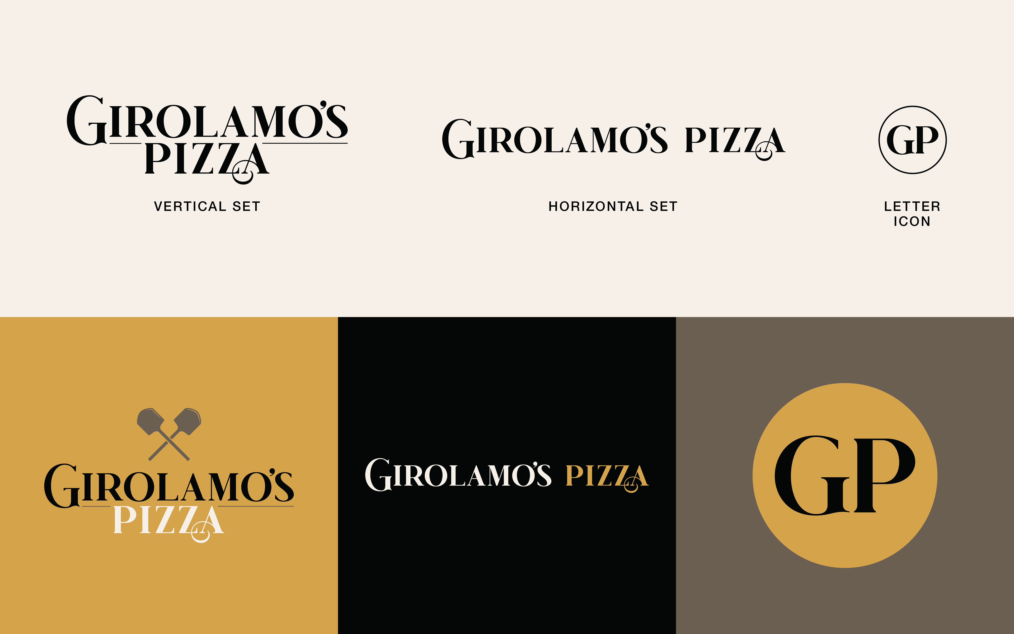 The full branding for Girolamo's Pizza, located in Brooklyn, NY. Logo & brand inspiration, concepts, final lockup, menu design, social media content, mock & real world signage. 2023