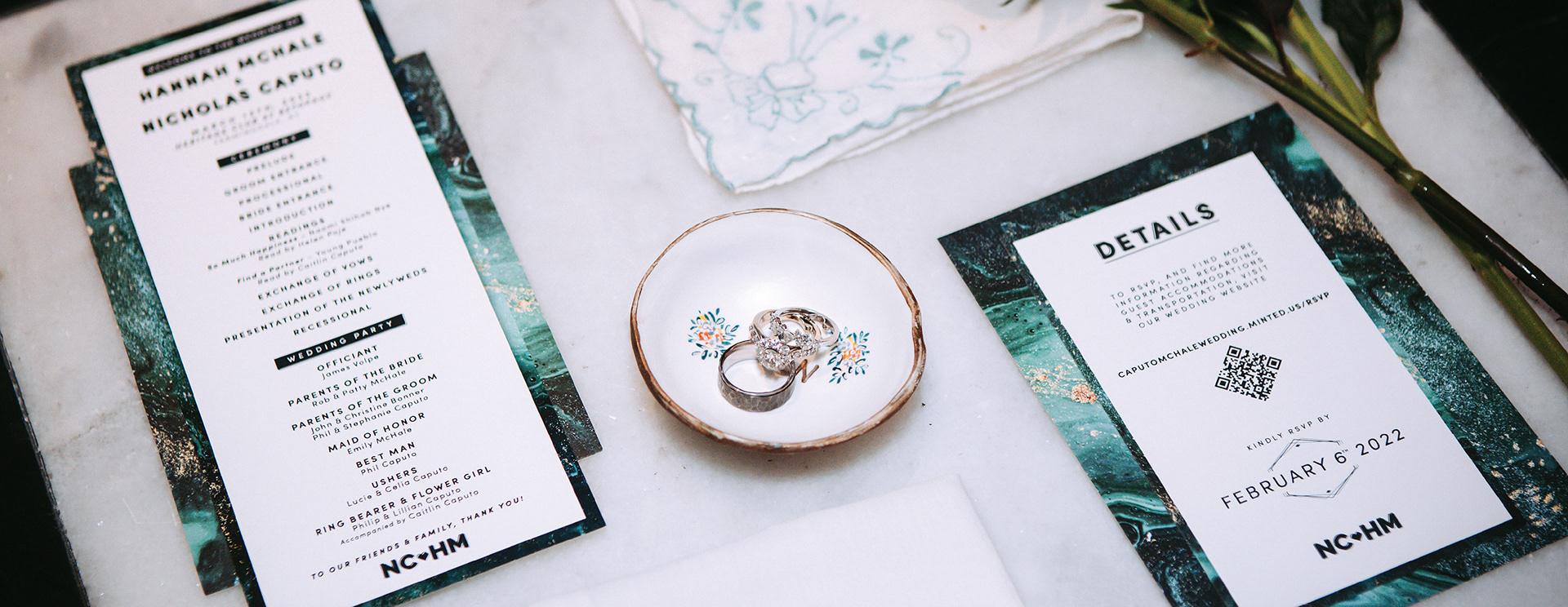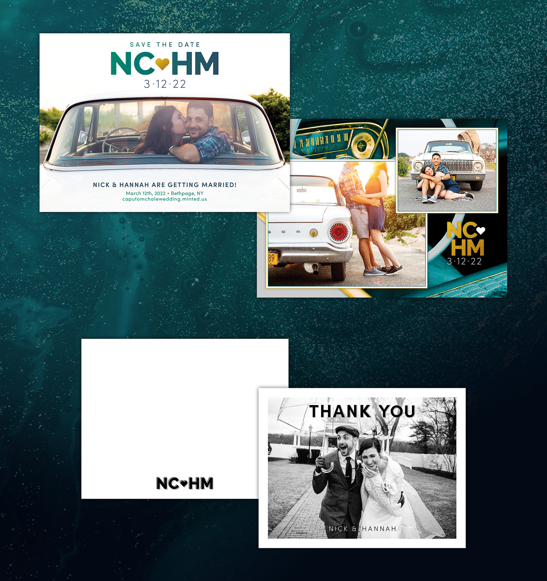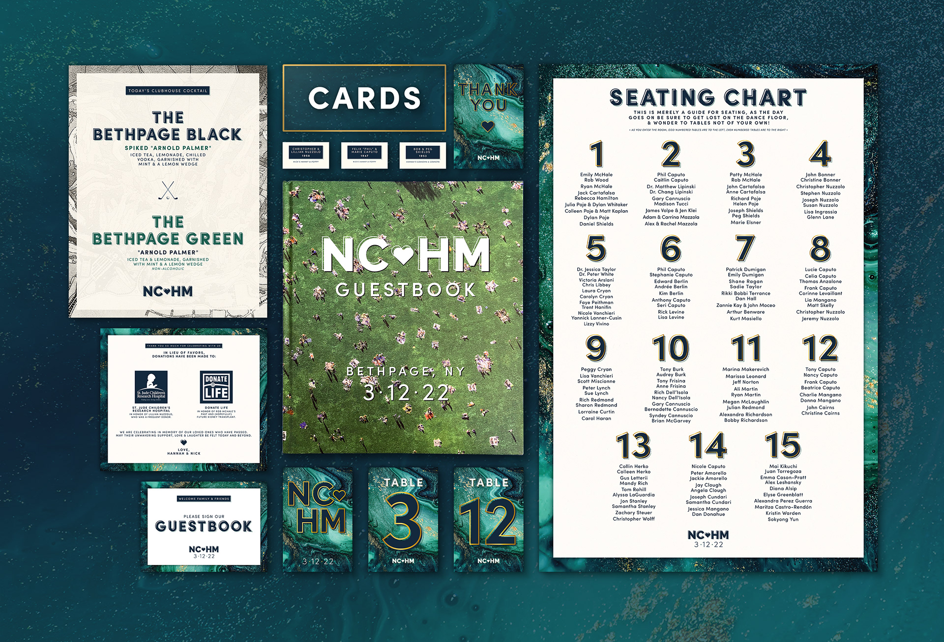 Wedding branding for my personal wedding on 3/12/2022. Content includes: logo design, invitation design, save the date & thank you card design, seating chart layout, ceremony program design, table card frames, and other misc. signage.